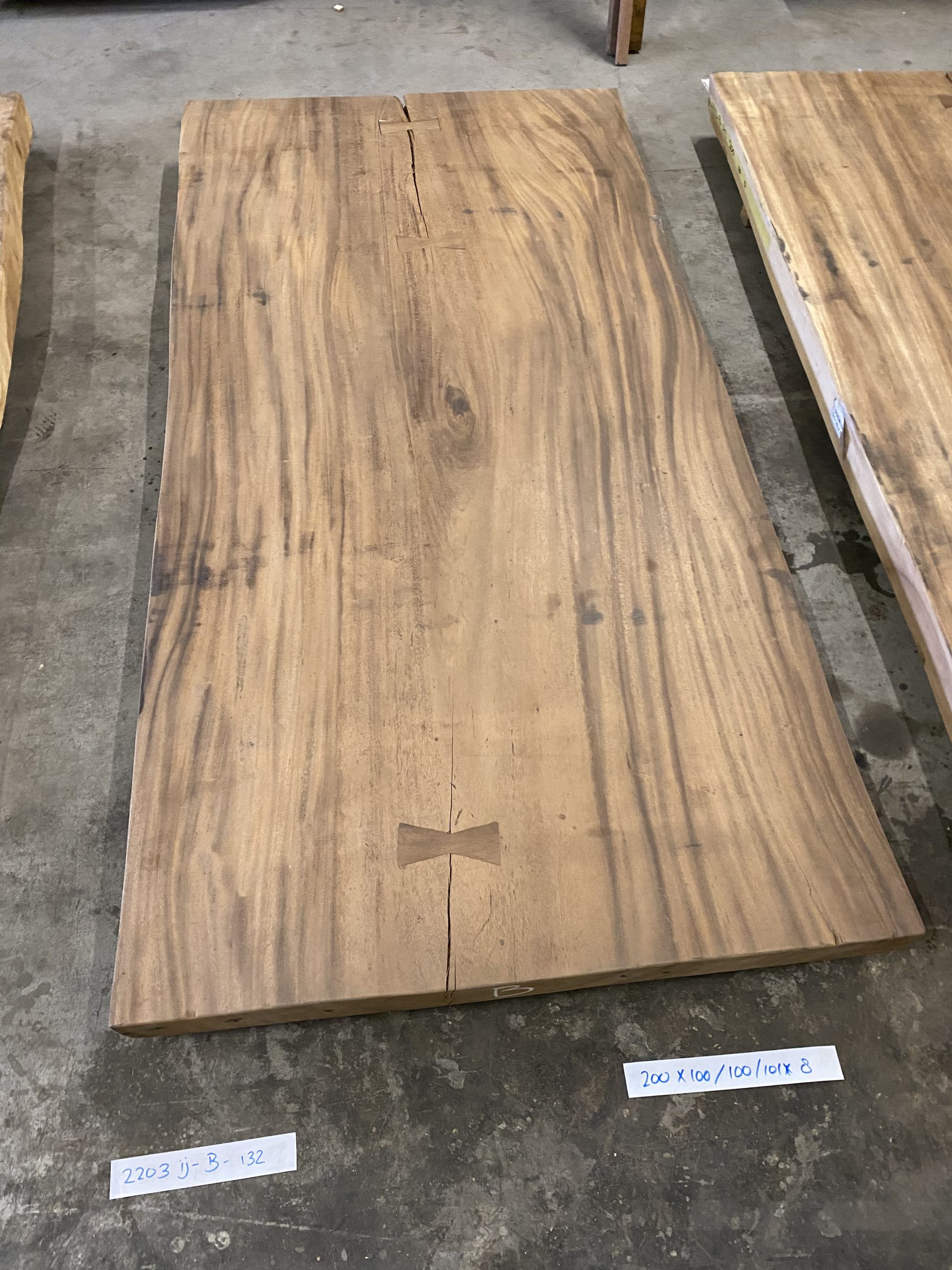 Dit tafelblad is voorzien van twee stalen pinnen tegen het krom trekken van het blad. Het blad is volledig uit één deel (plak van een boom). Hierdoor heeft het blad echt de natuurlijke uitstraling. Het blad op de foto is nog onbehandeld en opgeschuurd. Wanneer het blad geschuurd en behandeld wordt krijgt u nog mooier de tekeningen van het hout te zien. Al onze suar tafelbladen zijn te bezichtigen in onze showroom, zo weet u precies wat u kunt verwachten van het blad. Wij adviseren u dan ook om wanneer deze mogelijkheid er is langs te komen in onze showroom. Voor openingstijden en adres kunt u hier terecht.