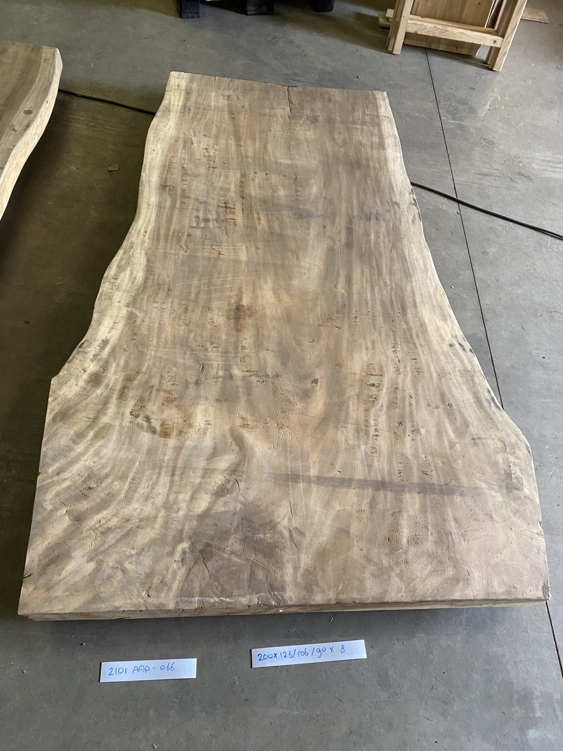 Dit tafelblad is voorzien van twee stalen pinnen tegen het krom trekken van het blad. Het blad is volledig uit één deel (plak van een boom). Hierdoor heeft het blad echt de natuurlijke uitstraling. Het blad op de foto is nog onbehandeld en opgeschuurd. Wanneer het blad geschuurd en behandeld wordt krijgt u nog mooier de tekeningen van het hout te zien. Al onze suar tafelbladen zijn te bezichtigen in onze showroom, zo weet u precies wat u kunt verwachten van het blad. Wij adviseren u dan ook om wanneer deze mogelijkheid er is langs te komen in onze showroom. Voor openingstijden en adres kunt u hier terecht.