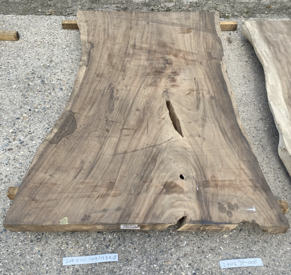 Het blad is volledig uit één stuk hout vervaardigd (een plak van de boom), wat zorgt voor een authentieke, natuurlijke uitstraling. Het blad op de foto is nog onbehandeld. Na het schuren en behandelen komen de unieke houttekeningen nog mooier naar voren, waardoor het blad nóg meer tot leven komt.