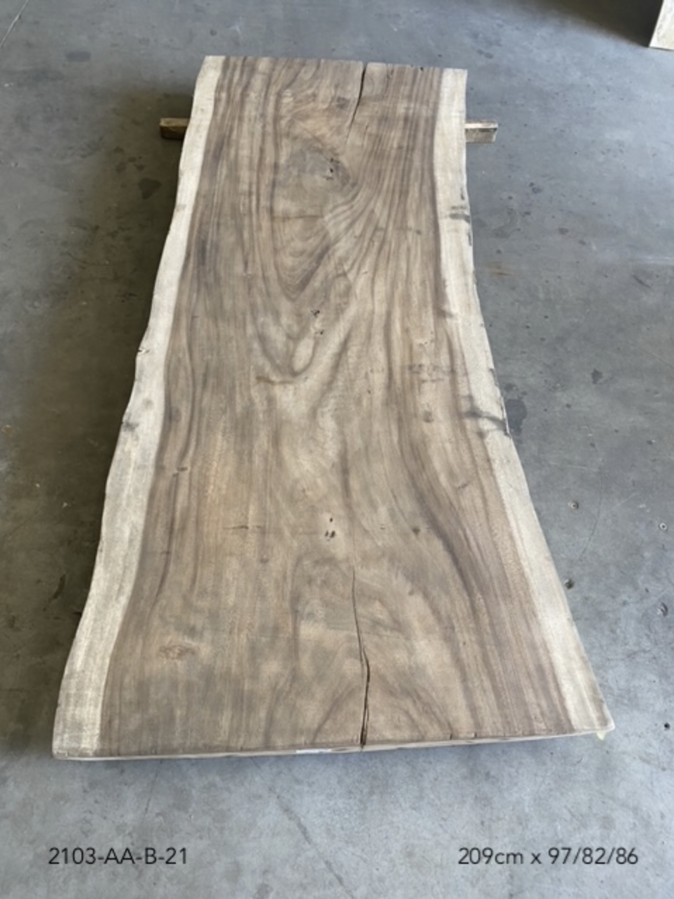 Dit tafelblad is voorzien van twee stalen pinnen tegen het krom trekken van het blad. Het blad is volledig uit één deel (plak van een boom). Hierdoor heeft het blad echt de natuurlijke uitstraling. Het blad op de foto is nog onbehandeld en opgeschuurd. Wanneer het blad geschuurd en behandeld wordt krijgt u nog mooier de tekeningen van het hout te zien. Al onze suar tafelbladen zijn te bezichtigen in onze showroom, zo weet u precies wat u kunt verwachten van het blad. Wij adviseren u dan ook om wanneer deze mogelijkheid er is langs te komen in onze showroom. Voor openingstijden en adres kunt u hier terecht.