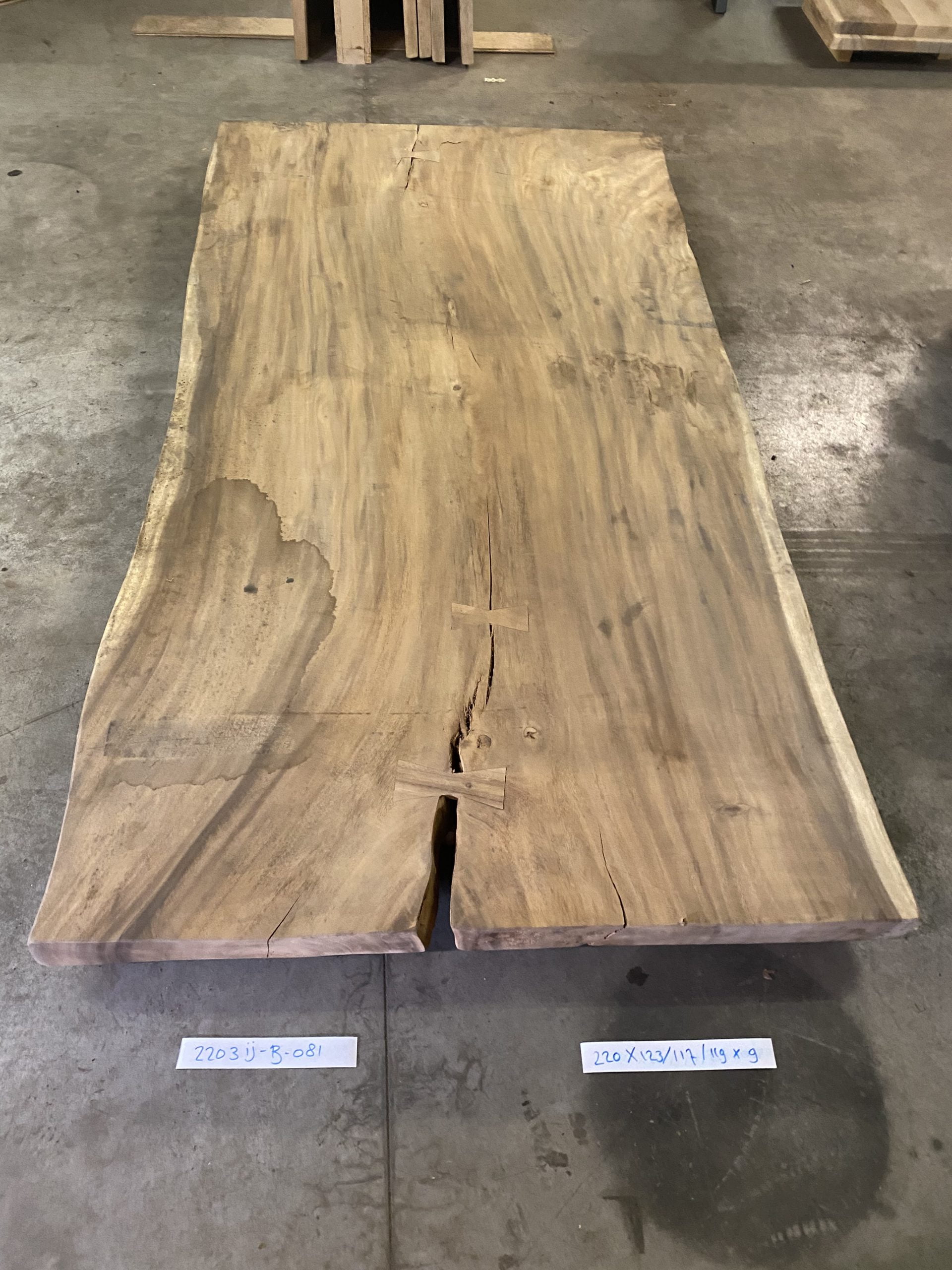 Dit tafelblad is voorzien van twee stalen pinnen tegen het krom trekken van het blad. Het blad is volledig uit één deel (plak van een boom). Hierdoor heeft het blad echt de natuurlijke uitstraling. Het blad op de foto is nog onbehandeld en opgeschuurd. Wanneer het blad geschuurd en behandeld wordt krijgt u nog mooier de tekeningen van het hout te zien. Al onze suar tafelbladen zijn te bezichtigen in onze showroom, zo weet u precies wat u kunt verwachten van het blad. Wij adviseren u dan ook om wanneer deze mogelijkheid er is langs te komen in onze showroom. Voor openingstijden en adres kunt u hier terecht.