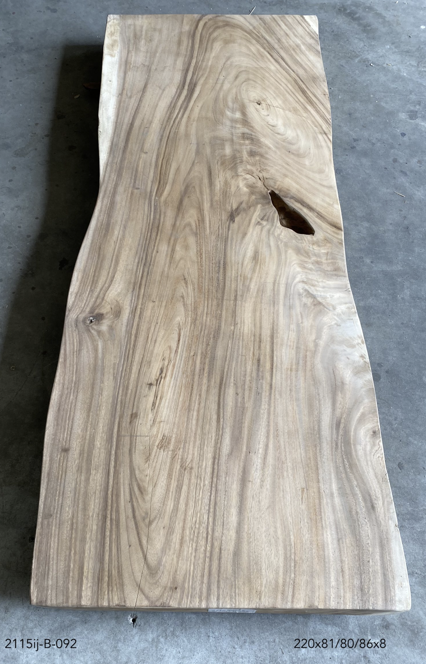 Dit tafelblad is voorzien van twee stalen pinnen tegen het krom trekken van het blad. Het blad is volledig uit één deel (plak van een boom). Hierdoor heeft het blad echt de natuurlijke uitstraling. Het blad op de foto is nog onbehandeld en opgeschuurd. Wanneer het blad geschuurd en behandeld wordt krijgt u nog mooier de tekeningen van het hout te zien. Al onze suar tafelbladen zijn te bezichtigen in onze showroom, zo weet u precies wat u kunt verwachten van het blad. Wij adviseren u dan ook om wanneer deze mogelijkheid er is langs te komen in onze showroom. Voor openingstijden en adres kunt u hier terecht.