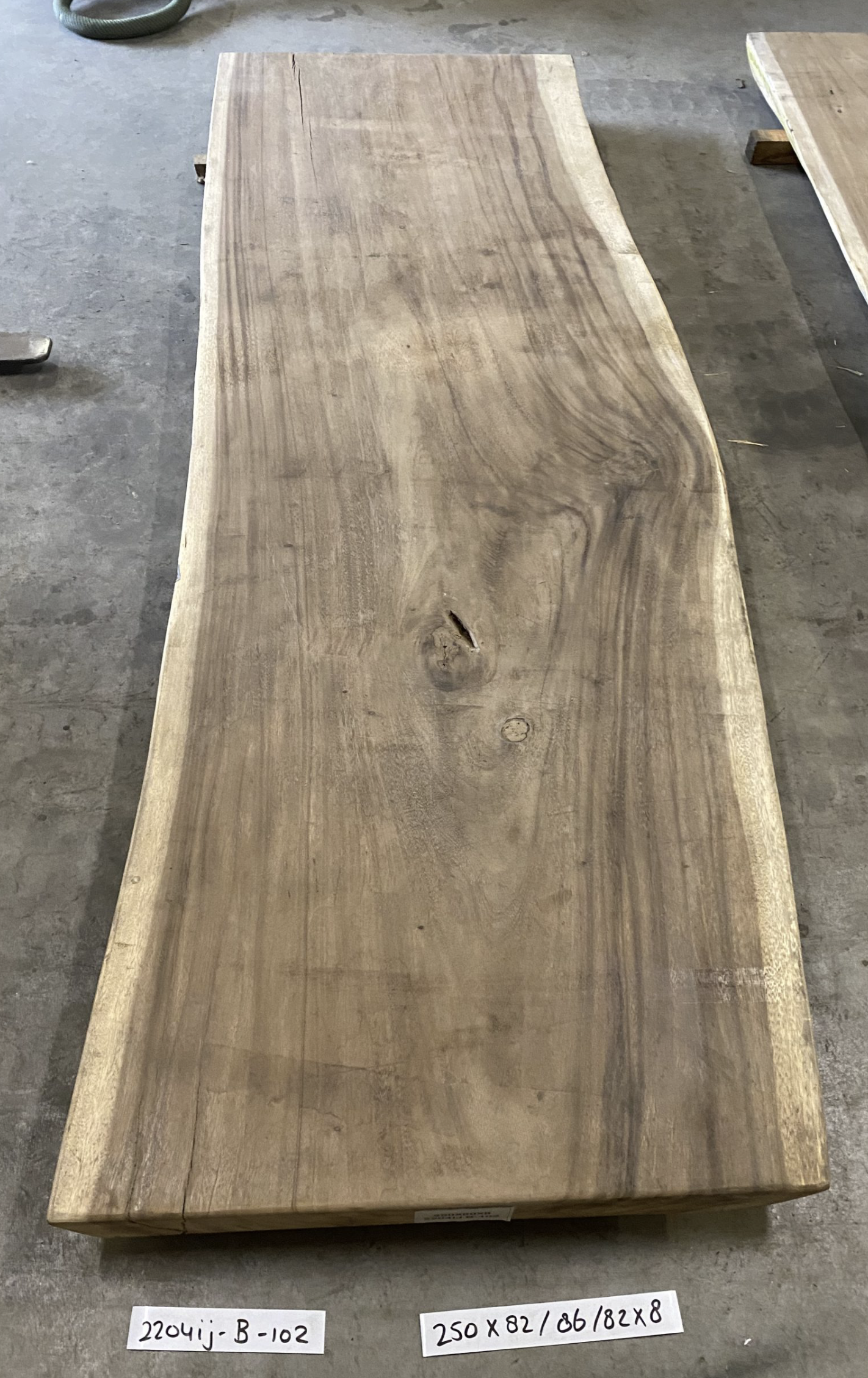 Dit tafelblad is voorzien van twee stalen pinnen tegen het krom trekken van het blad. Het blad is volledig uit één deel (plak van een boom). Hierdoor heeft het blad echt de natuurlijke uitstraling. Het blad op de foto is nog onbehandeld en opgeschuurd. Wanneer het blad geschuurd en behandeld wordt krijgt u nog mooier de tekeningen van het hout te zien. Al onze suar tafelbladen zijn te bezichtigen in onze showroom, zo weet u precies wat u kunt verwachten van het blad. Wij adviseren u dan ook om wanneer deze mogelijkheid er is langs te komen in onze showroom. Voor openingstijden en adres kunt u hier terecht.