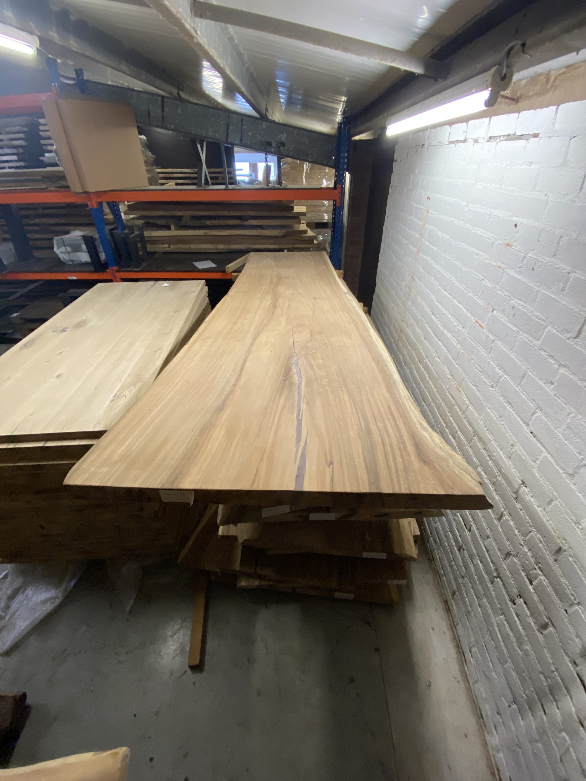 Het blad is volledig uit één stuk hout vervaardigd (een plak van de boom), wat zorgt voor een authentieke, natuurlijke uitstraling. Het blad op de foto is nog onbehandeld. Na het schuren en behandelen komen de unieke houttekeningen nog mooier naar voren, waardoor het blad nóg meer tot leven komt.