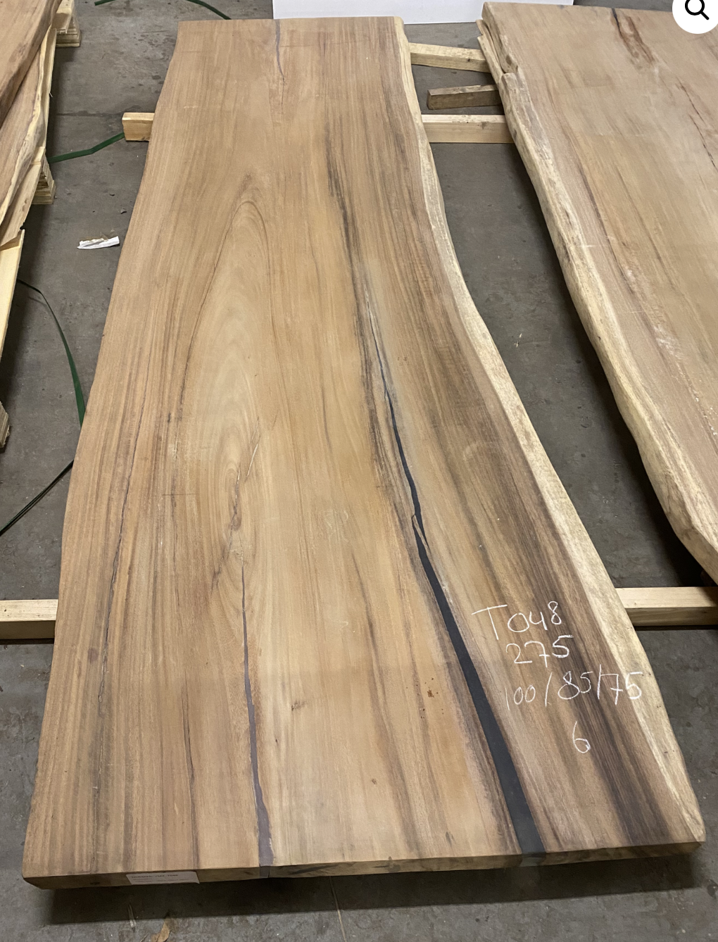 Dit tafelblad is voorzien van twee stalen pinnen tegen het krom trekken van het blad. Het blad is volledig uit één deel (plak van een boom). Hierdoor heeft het blad echt de natuurlijke uitstraling. Het blad op de foto is nog onbehandeld en opgeschuurd. Wanneer het blad geschuurd en behandeld wordt krijgt u nog mooier de tekeningen van het hout te zien. Al onze suar tafelbladen zijn te bezichtigen in onze showroom, zo weet u precies wat u kunt verwachten van het blad. Wij adviseren u dan ook om wanneer deze mogelijkheid er is langs te komen in onze showroom. Voor openingstijden en adres kunt u hier terecht.
