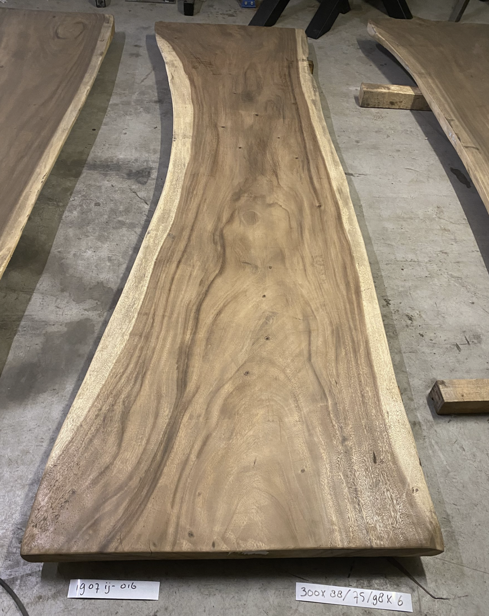 Dit tafelblad is voorzien van twee stalen pinnen tegen het krom trekken van het blad. Het blad is volledig uit één deel (plak van een boom). Hierdoor heeft het blad echt de natuurlijke uitstraling. Het blad op de foto is nog onbehandeld en opgeschuurd. Wanneer het blad geschuurd en behandeld wordt krijgt u nog mooier de tekeningen van het hout te zien. Al onze suar tafelbladen zijn te bezichtigen in onze showroom, zo weet u precies wat u kunt verwachten van het blad. Wij adviseren u dan ook om wanneer deze mogelijkheid er is langs te komen in onze showroom. Voor openingstijden en adres kunt u hier terecht.