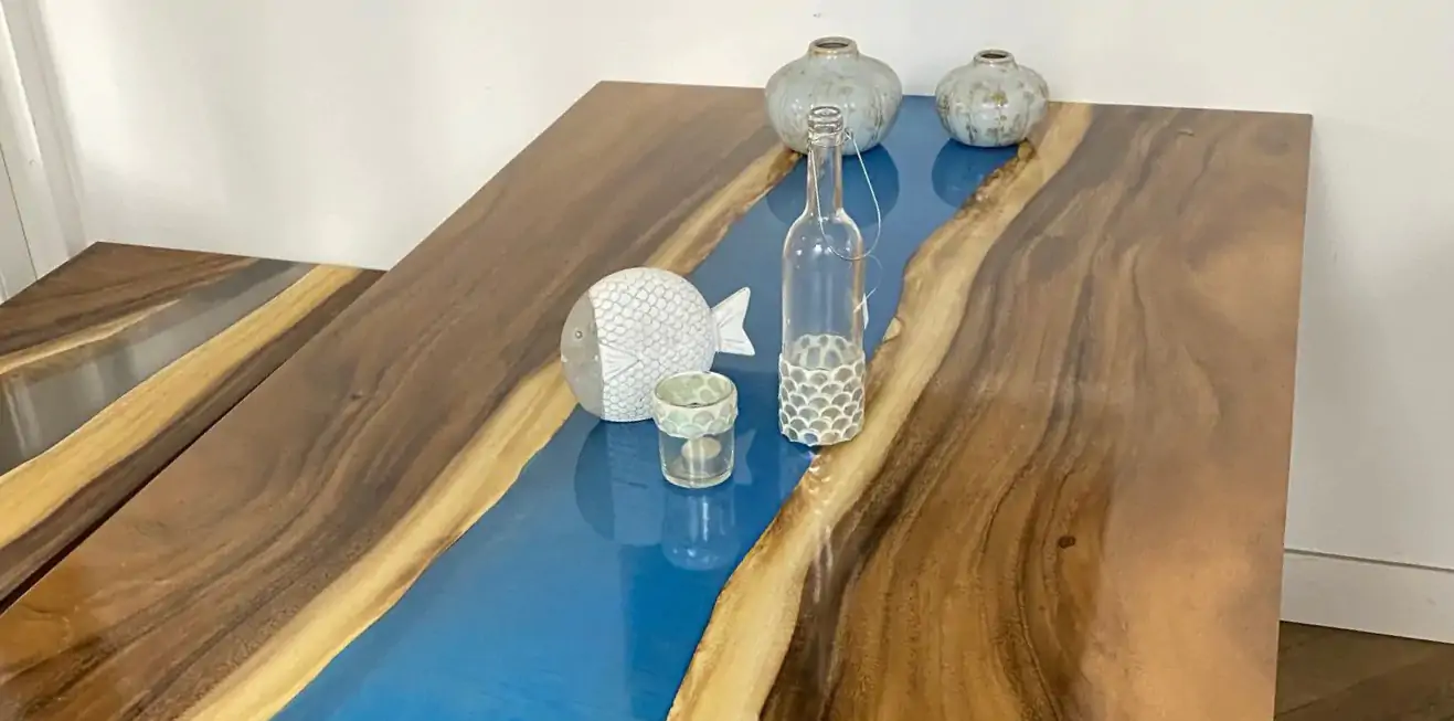 - Massief boomstam tafelbladen, opgevuld en geschuurd