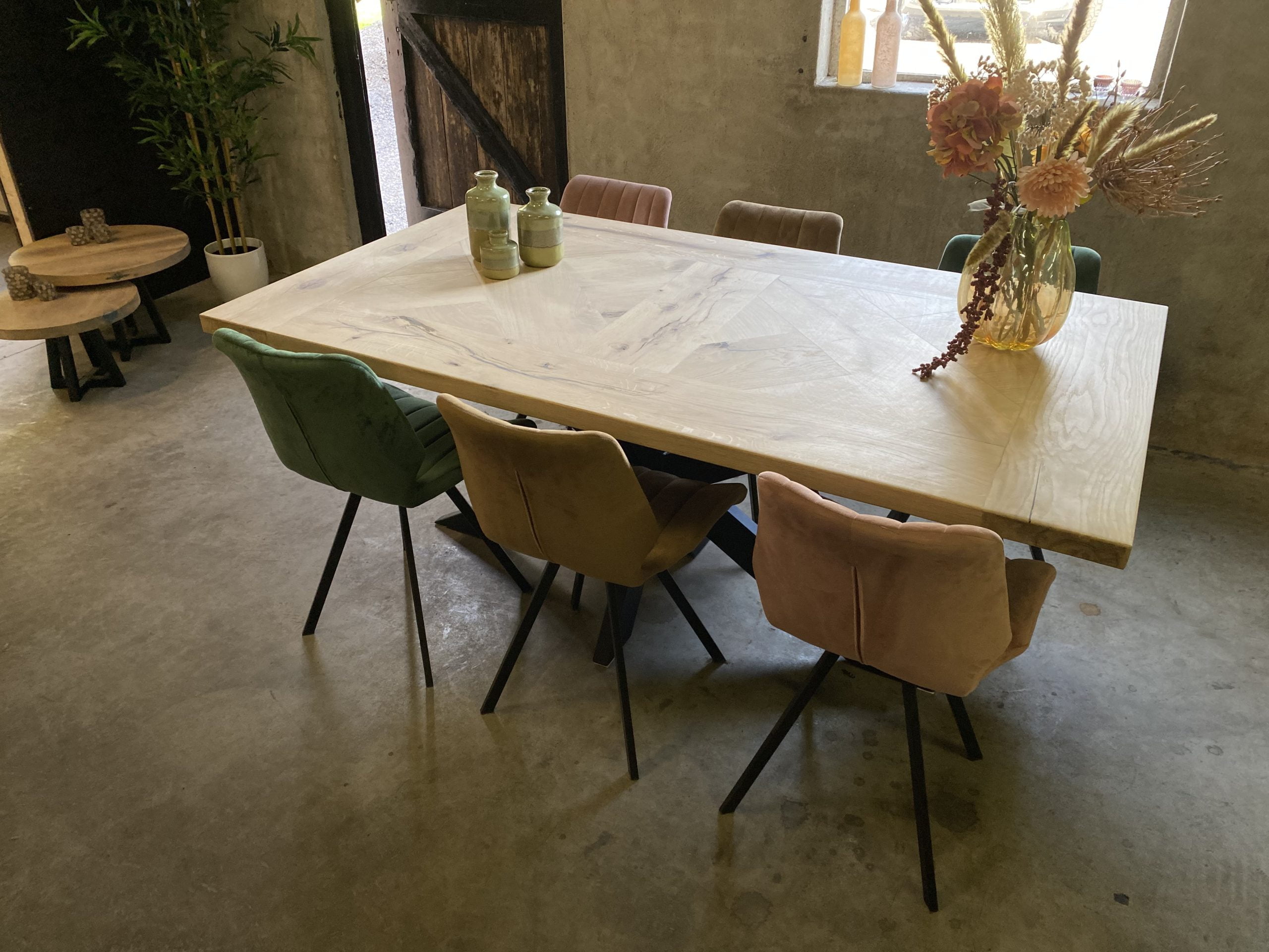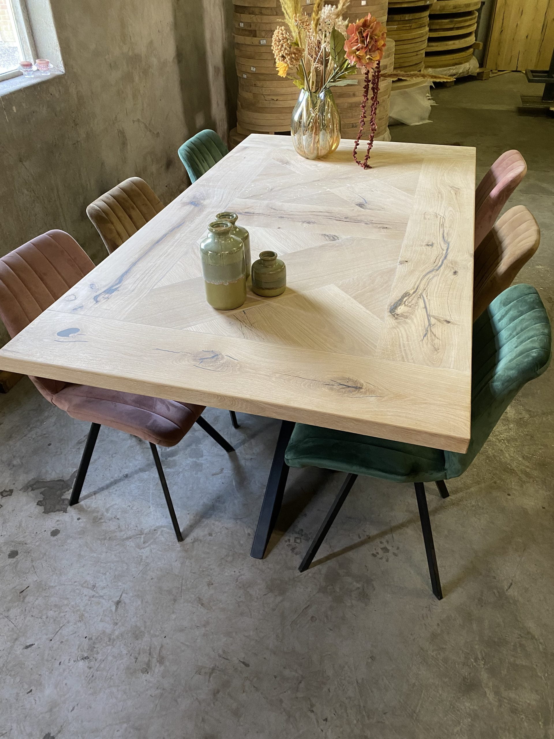 Bij De Tafelboerderij hebben we een uitgebreid assortiment tafelbladen, waaronder het prachtige eiken kruis tafelblad. Deze bladen zijn beschikbaar in verschillende maten en we hebben er altijd meerdere op voorraad. Bezoek onze showroom om persoonlijk uw perfecte blad te selecteren. We adviseren u langs te komen, zodat u precies weet welk blad u krijgt bij uw bestelling. Onze eiken kruis tafelbladen hebben een omlijsting van 10 cm, wat zorgt voor een klassieke en tijdloze uitstraling.