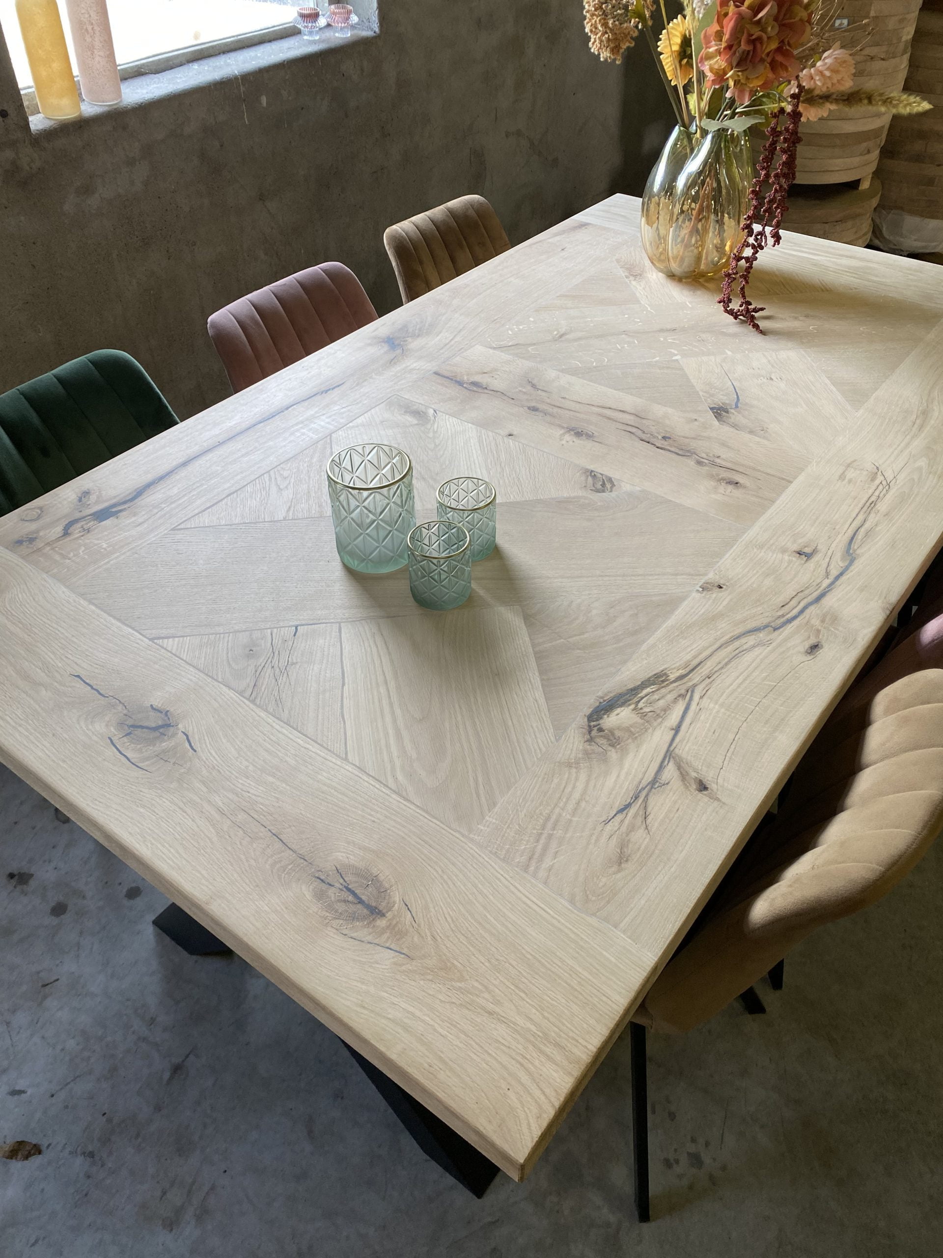 Bij de VloerenFabriek hebben wij een groot assortiment tafelbladen, hieronder valt ook dit prachtige eiken kruis tafelblad. Wij hebben onze eiken Kruis tafelbladen in veel verschillende maten waarvan wij er altijd meerdere op voorraad hebben. Bij ons in de showroom kunt u daarom altijd uw eigen blad uitzoeken. Ons advies is ook om bij ons langs te komen zodat u precies weet welk blad u kunt verwacht bij bestelling. Onze eiken kader tafelbladen hebben rondom een kader van 10cm. Dit geeft een mooie klassieke uitstraling. Met een eiken kader tafelbladen heeft u een mooie tijdloze tafel.