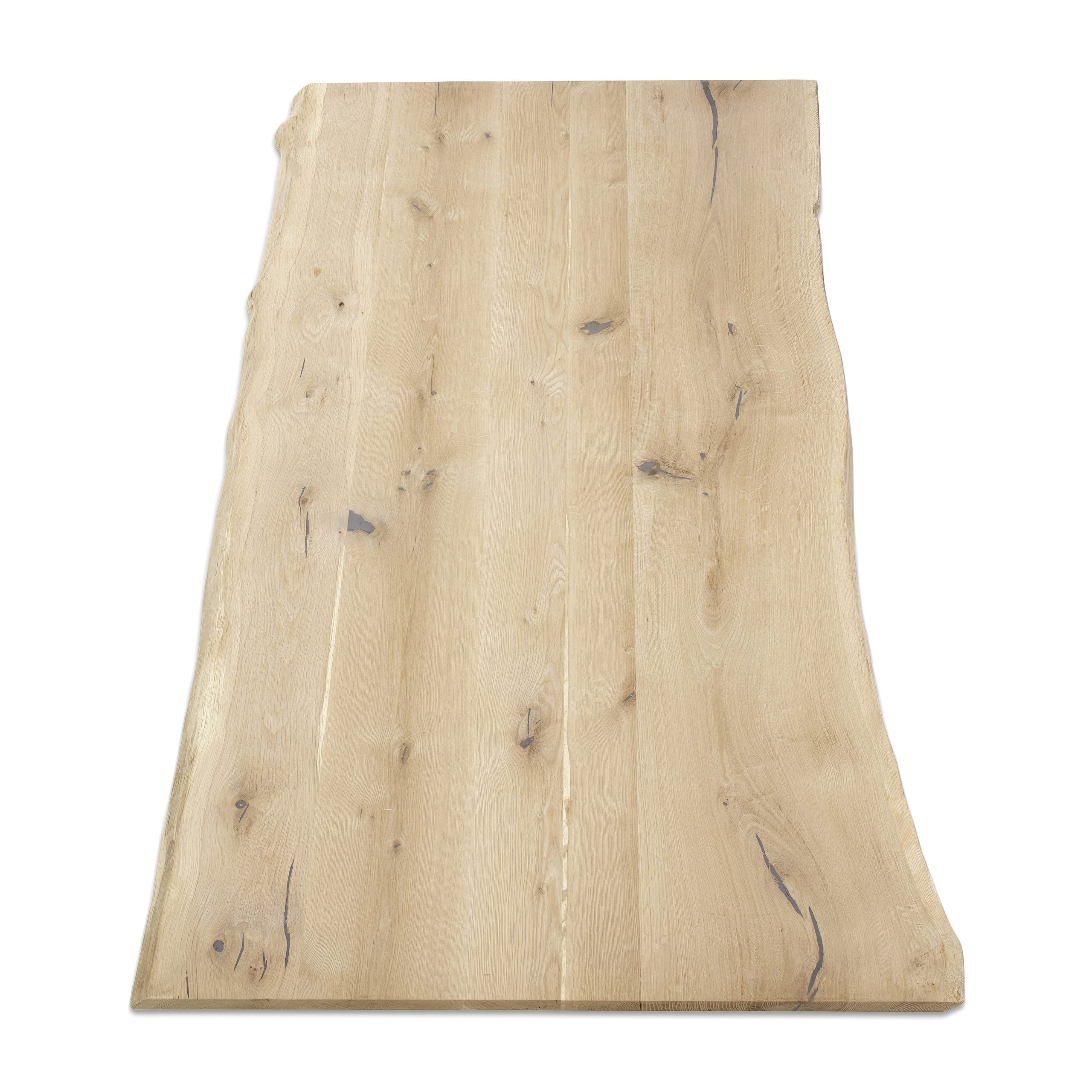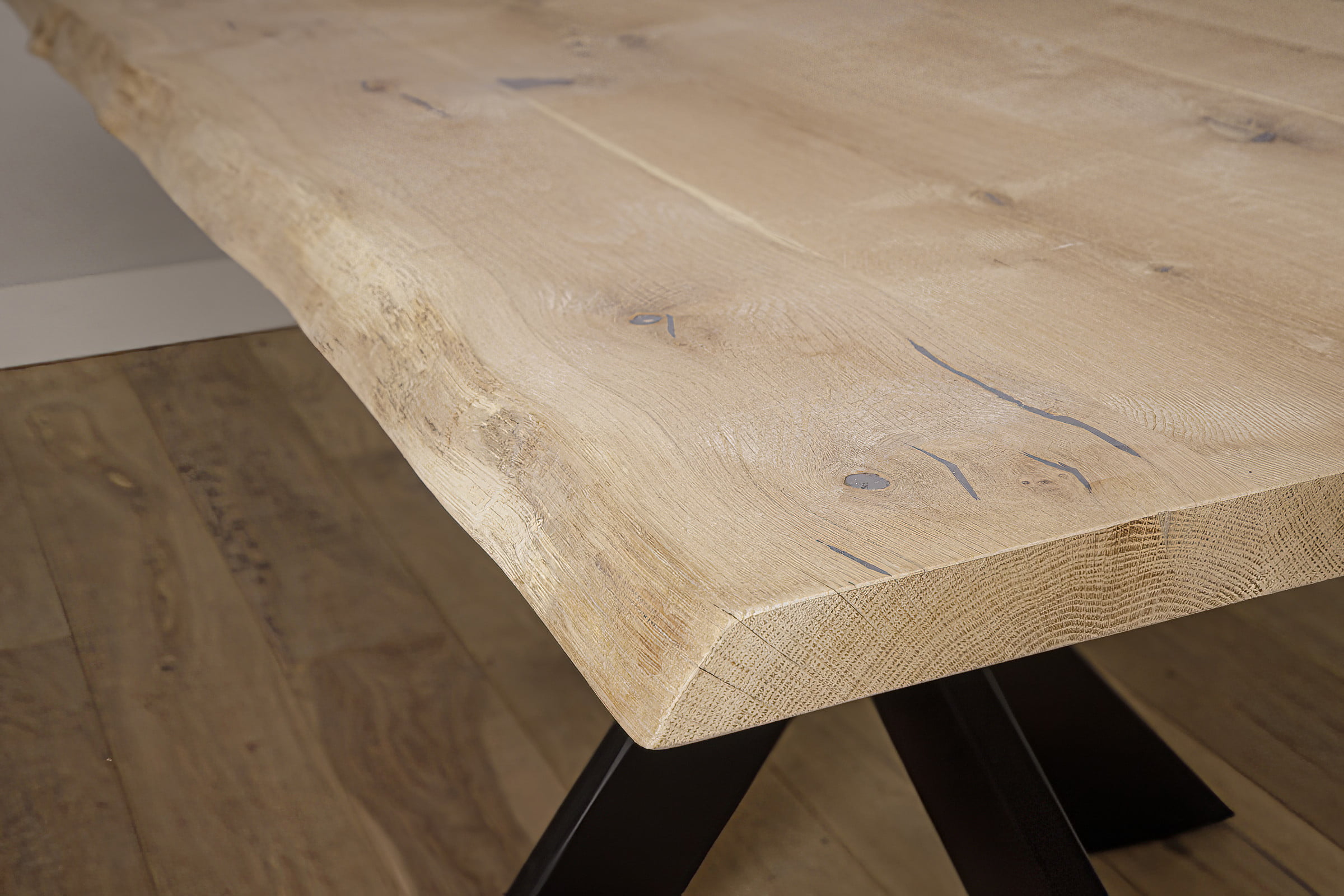 Onze massief eiken boomstam tafelbladen zijn standaard opgevuld en machinaal geschuurd, en kunnen op verschillende manieren worden behandeld. Iedere afwerking benadrukt het natuurlijke karakter van het hout, met behoud van de unieke noesten, nerven en houttekening.