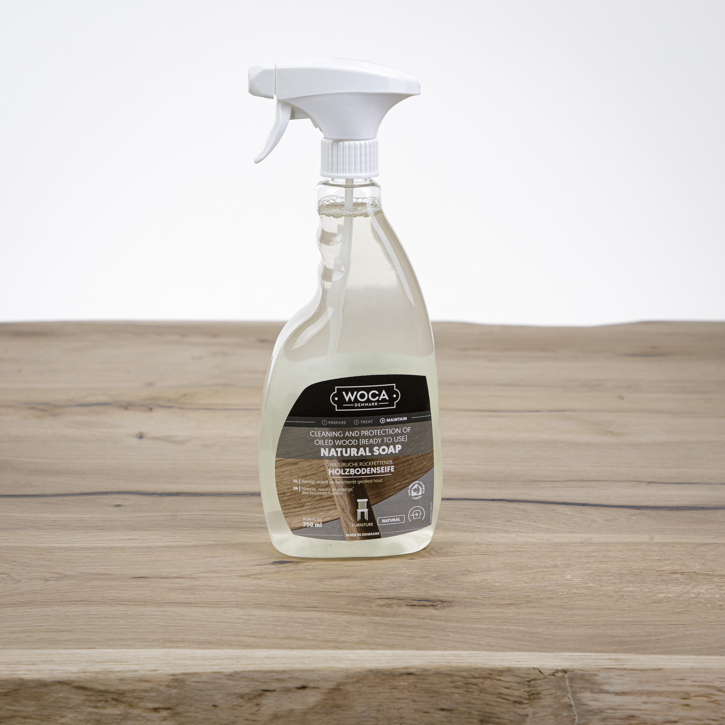 WOCA Natuurzeep in Spray is ideaal voor het reinigen en onderhouden van geoliede, en met zeep behandelde oppervlakken. De zeep is van speciale kwaliteit, die dankzij zijn voedende eigenschappen de poriën in het hout dicht, het hout beschermt tegen vuil en indringing van vloeistoffen. ‘Naturel’ wordt gebruikt voor naturel en gekleurd geoliede oppervlakken, ‘Wit’ voor wit geoliede oppervlakken. Deze gebruiksklare spray maakt het onderhoud van meubilair, tafelbladen, deuren, panelen, trappen, vloeren heel eenvoudig.
